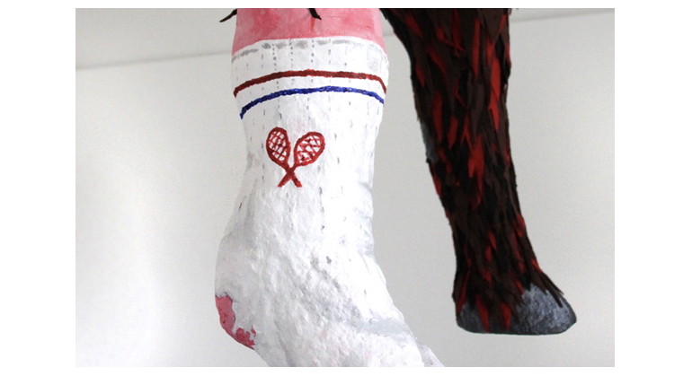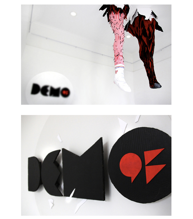 Making the most of a small space, we decided to play with scale and the installation consisted in two giant legs crushing the ceiling.